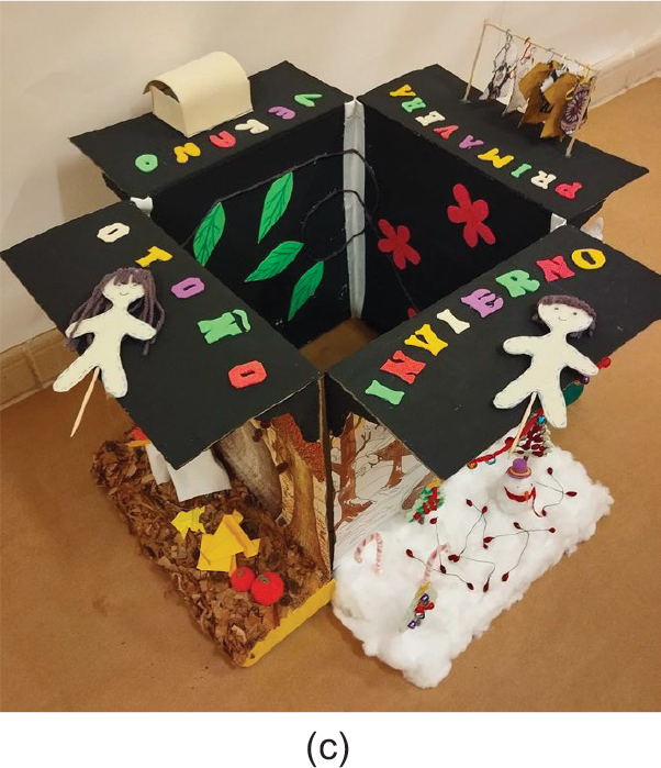 En la siguiente imagen a la izquierda, aparece una maqueta de las cuatro estaciones, realizada en cuatro pisos donde en cada superficie se representa una estación (véase Figura 7a). Para poder llevar esto a una instalación para niños se diseñó una construcción poliédrica que se podía cerrar como si fuera un cubo. El plano vertical donde estaban realizados los dibujos era detallado con lápices de colores y en cada fase estacional se le añadió con material aditivo la creación de figuras o complementos construidos con plegado de papel, telas, plastilina o letras realizadas en goma EVA. La idea de la instalación es que se pudiera plegar, desplegar y que fuera móvil para llevarla a otros lugares (véanse Figuras 7b y 7c).