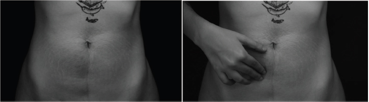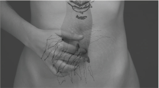 La pieza se construye en video blanco y negro, bajo una estética contenida y silenciosa. La cámara fija, la luz suave y el encuadre centrado en el abdomen crean un espacio íntimo donde todo ocurre con lentitud y atención (Figura 3). El cuerpo aparece expuesto como territorio sensible en donde la acción comienza con una caricia, la mano explora la piel buscando los surcos y cicatrices del embarazo, tocar es una forma de recordar, la piel que ha sido tantas veces invisibilizada, ocultada, se convierte en la primera voz del cuerpo (Figura 4).