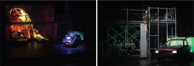 La narrativa rompe con las estructuras tradicionales del drama y se configura como un collage de capas, medios y materialidades, con un claro enfoque de crítica social. En sintonía con el teatro postdramático, la escena combina acciones performativas que conviven con los testimonios en primera persona, imágenes de video, proyecciones en gran escala y música en vivo (Figura 1b). Además de valerse del archivo gráfico y testimonial de las ex-presas, Arias convierte el escenario en un cruce entre comedia musical y set de rodaje (roadmovie, croma) (Figura 1a). De este modo, los límites entre la ficción, la reconstrucción de momentos pasados y la ruptura de la cuarta pared, confluyen en esta dramaturgia intermedial donde el medio audiovisual da forma y contenido a la experiencia escénica.