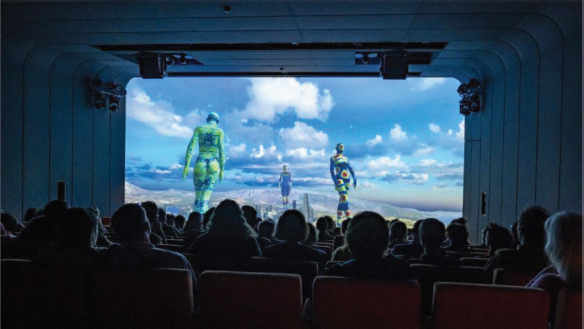 Tras este breve prólogo, la audiencia pasa a otro universo y se sumerge en la pantalla de cine donde se presenta la película en plena oscuridad del teatro (véase Figura 3). Sobre la proyección, una animación llena de colores recrea una ciudad futurista y algo psicodélica de gran belleza digital que se va animando y transformando en tiempo real a partir de la información e interacción con la coreografía que se está desarrollando en ese mismo instante en Suiza.