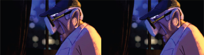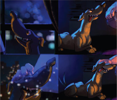 Pero en esta pieza, además de a Emiliano, se puede ver a otro personaje que le acompaña en su hogar, se trata de su perro. Este personaje, inspirado en un ser muy especial y real, se vinculó al personaje del anciano para que nos ayudara a conocerlo un poco mejor. En una historia en la que no hay diálogos, en la que el personaje vive solo, aislado, sin interactuar con nadie más, y de tan solo 4 minutos de duración, el único modo de conocer algo más de él es a través de los ojos y reacciones de su compañero. La mayoría de las personas hemos convivido o conocemos a un perro. Estos animales, al margen de su raza, educación o personalidad, son seres leales y puros, entendiendo estas acepciones en su relación con los seres humanos. Según un perro se relacione con su humano, su actitud puede dar mucha información sobre esa persona. Por muy seria que la veamos, callada o sola, si el perro que la acompaña le mira con cariño, lleva el rabo alto, incluso lo mueve cuando su humano lo acaricia, o jadea a la vez que cierra los ojos mientras lo hace, esas son pequeñas pistas que nos dicen que existe un vínculo especial cimentado desde el cariño, el respeto y el cuidado mutuo (Figura 11). Estas cuestiones parten de mi experiencia con los perros que he tenido a lo largo de mi vida y con aquellos que conozco en mi entorno. Nuestro personaje canino representa la evidencia de que el señor mayor que estamos viendo junto a él reúne todas esas cualidades que un perro feliz necesita: ser cuidado, ser querido y ser respetado.