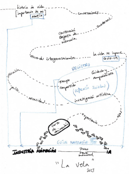 La siguiente imagen (Figura 4) sintetiza gráficamente el proceso de ideación y desarrollo del proyecto La vela (2023), en el que la historia de vida y la experiencia relacional actúan como detonantes de una indagación artística inmanente. Este planteamiento se prolonga y se materializa en las fases creativas y productivas del proyecto.