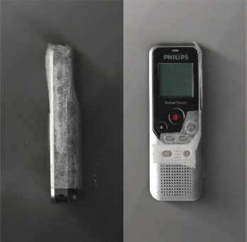 Un día de los que fui a cuidarle, le miré fijamente por encima de mi mascarilla, desde la otra punta del salón (tomando la distancia que se recomendaba para evitar posibles contagios) y pensé que mi abuelo ya era mayor (tenía entonces 90 años). Aunque estaba en plenas facultades mentales y físicas, salvo por la ceguera casi total en la que se había sumergido en los últimos años, en aquel momento fui consciente de que se encontraba en el final de su larga vida. Así, cuando ese día me fui de allí compré una grabadora de voz que me llegó puntualmente a mi casa al día siguiente. Pero no era para mí. Cuidadosamente la preparé utilizando esparadrapo, dejando al descubierto los dos únicos botones imprescindibles para su correcto manejo (Figura 5). Mi intención era que, fuera de los pequeños ratos que compartíamos en cada visita confinada, mi abuelo intentara registrar los audios de sus historias narradas, sus experiencias de vida, para guardarlas y preservarlas de su viva voz.