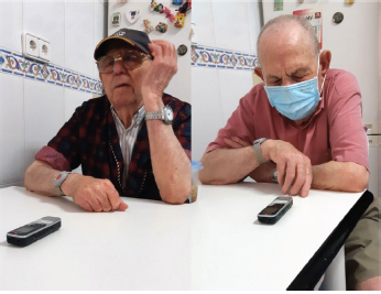 En años anteriores ya le había pedido que me escribiera en un cuaderno los refranes, sainetes y demás dichos populares que frecuentemente nos dedicaba. Pero la vista le abandonó y con ella la posibilidad de seguir escribiendo. Por este motivo, se me ocurrió que la grabadora podría ser un medio de registro adecuado, dadas las circunstancias, con el único inconveniente de que él nunca había utilizado nada parecido y, sin apenas visión (solo tenía un 10%), el reto de aprender su manejo parecía complejo. Para mi sorpresa, mi abuelo lo aprendió de manera eficaz (Figura 6) y pudo realizar varias grabaciones hablando(nos) de sus cosas, de sus recuerdos, incluso de sus intimidades. Treinta y ocho fueron los clips que grabó en aquellos días. Algunos de una hora, otros de diez minutos, pero todos ellos cargados de su verdad y vitalidad veterana.