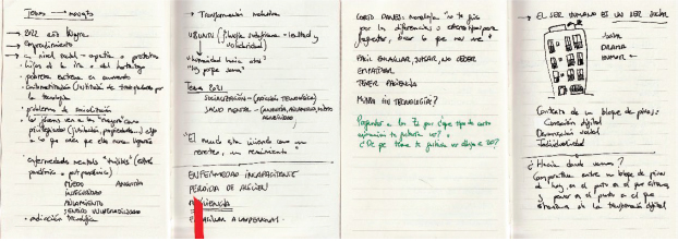 Esta herramienta es el contenedor del pensamiento materializado gráfica y caligráficamente. Es un elemento estable y finito de negociación entre la mente del creador y su capacidad de materializar su imaginación en la búsqueda del tema para dar sentido a la investigación y a su proyección social. El cuaderno de trabajo dentro del proyecto es donde se recogen las subjetividades a partir de interacciones y “representaciones de procesos no-lineales, rizomáticos, que se expanden, modifican e interrelacionan según el propio proceso avanza.” (Rey y Martín, 2020, p.114)