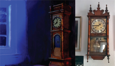 Figura 9: Frame de La vela (2023) donde puede ver la recreación del reloj de péndulo (a la derecha de la figura) que Emiliano tenía en su casa.