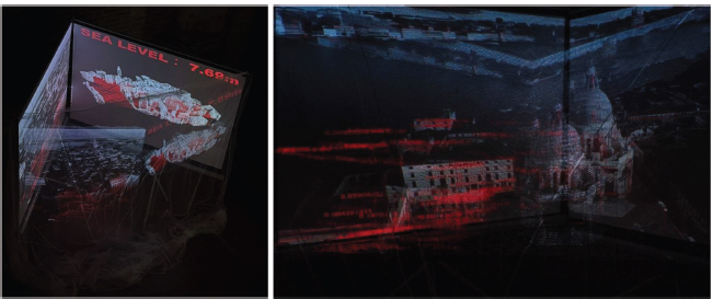 La instalación multimedia Dati Marea (Figura 2a y 2b), adoptando estrategias visivas, sonoras y espaciales, transforma los datos científicos relativos a las mareas, el nivel del agua y la contaminación de la laguna de Venecia en una experiencia inmersiva de luces, sonidos e imágenes abstractas, sirviéndose de la tecnología de los drones, el diseño digital y la inteligencia artificial. El proyecto traduce los datos científicos en una «memoria medioambiental» que es capaz de estimular los sentidos de los espectadores de la obra y crear una conexión emocional.