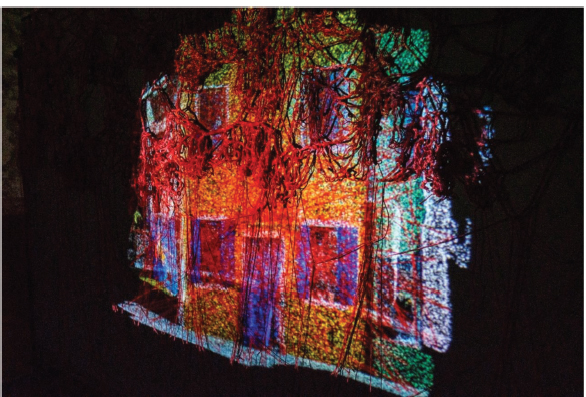 La obra es una instalación multimedia interactiva y escultórica realizada con TouchDesigner y consiste en una proyección sobre una tela blanca de elementos y edificios 3D y una escultura realizada con la técnica del crochet (Figura 3). Hilos rojos que, en la parte posterior de la pantalla, bajan desde el borde superior interfiriendo, con sus sombras, con la proyección. Los elementos y los edificios se componen y descomponen en varios fragmentos, unidos entre sí por una trama de hilos rojos, según los gestos de las manos del espectador detectados por la cámara. Al abrir las manos, el elemento se descompone, mientras que al cerrarlas se recompone. Detrás de la obra se esconde la voluntad de mostrar el Qi, es decir el flujo vital -concepto fundamental en la filosofía y tradición China- que anima y constituye también el lugar. Este Qi lineal es construido por los autores con el uso de filamentos de energía rojos que se entrelazan entre sí creando una cascada de Qi.