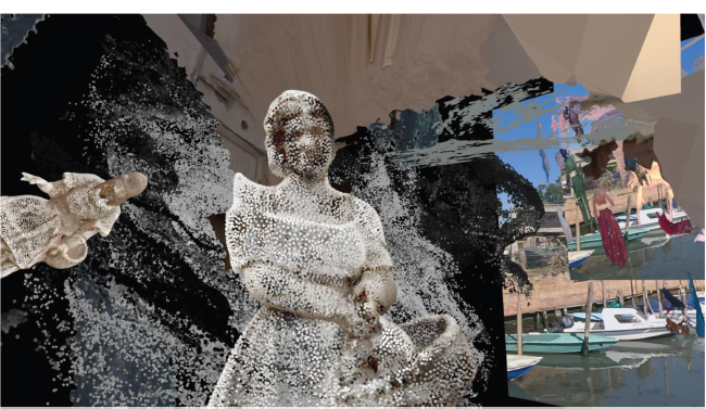 Si desentrañáramos los elementos visuales descritos arriba en el paisaje de Viaggio nella laguna, reconoceríamos puntos o corpúsculos; imágenes reales captadas por la cámara; fotogrametría; collages fotográficos; campos de transición y vacíos en los espacios negros (figura 4). En cuanto a la técnica, distinguiríamos las soluciones lowtech asimismo de tecnologías más avanzadas como la IA. La técnica no es otra cosa que el proceso creativo y, al mismo tiempo, la construcción reflexiva y teórica de la obra misma.