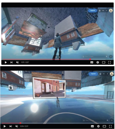 La obra Labirinto, por ejemplo, como una herramienta educativa y de sensibilización (Figura 5a e 5b), acoge en el espacio/plataforma virtual, historias e ideas de las comunidades de la Mariola. Se busca visibilizar los problemas sociales, promoviendo un diálogo constructivo entre ambas entidades y la participación ciudadana, para accionar iniciativas concretas hacia un futuro urbano más equitativo e inclusivo, mediante la creación de un espacio de encuentro en línea con modelado 3D. En el videojuego los dos barrios, Santa Marta y La Mariola se representan como mundos opuestos, espacialmente uno el revés del otros y, sin embargo, dialogantes.